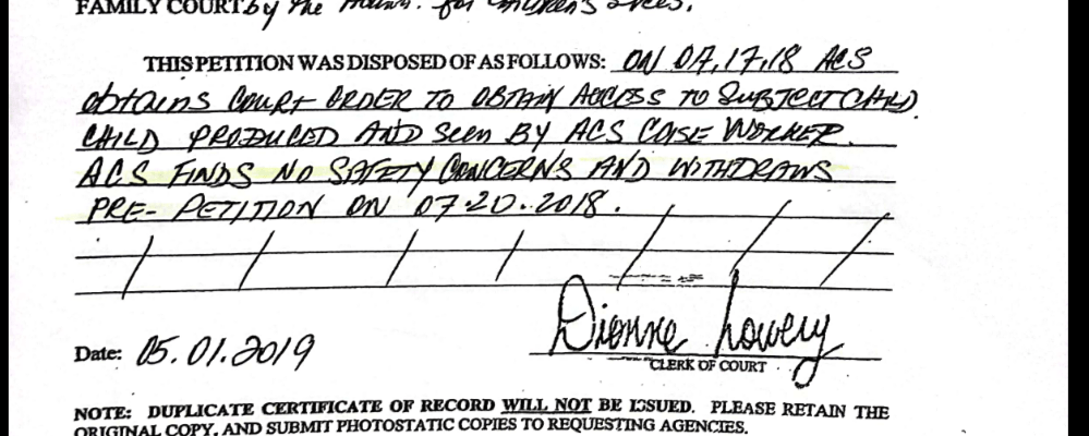 On July 7th, 2018, ACS files a pre-petition at Kings County Family Court as a result of the defamatory report made by WPA, in order to obtain access to my son. My son was seen by ACS that same day after I met with the Director of ACS in Manhattan to confirm that there was in fact, an active report. ACS found no safety concerns and withdrew the pre-petition shortly after.