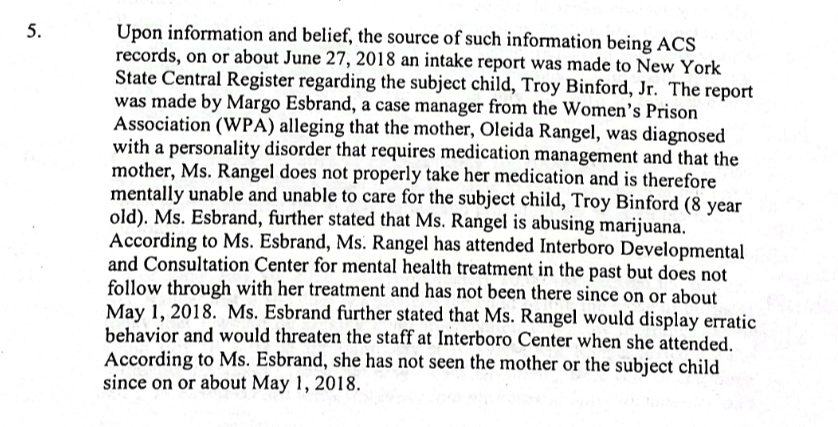 A malicious and defamatory ACS report was filed against me by a crooked woman named Margo Esbrand, a caseworker from an organization called, The Women’s Prison Association (WPA), alleging that I was diagnosed with a “personality disorder” that required medication management and that I was not taking such alleged medication and was therefor “mentally unable” to take care of my son. WPA further stated that I was abusing drugs and that I was attending a counseling center called “Interborough” for therapy but that I did not follow through with my treatment plan and had not been there since May 1st, 2018. WPA further stated that I would display erratic behavior by “threatening” the staff at Interborough.