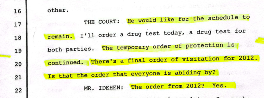 Photo above: Kings County Family Court’s Transcripts from March 13th, 2019. Idehen verbally confirms the validity of the final custody order.