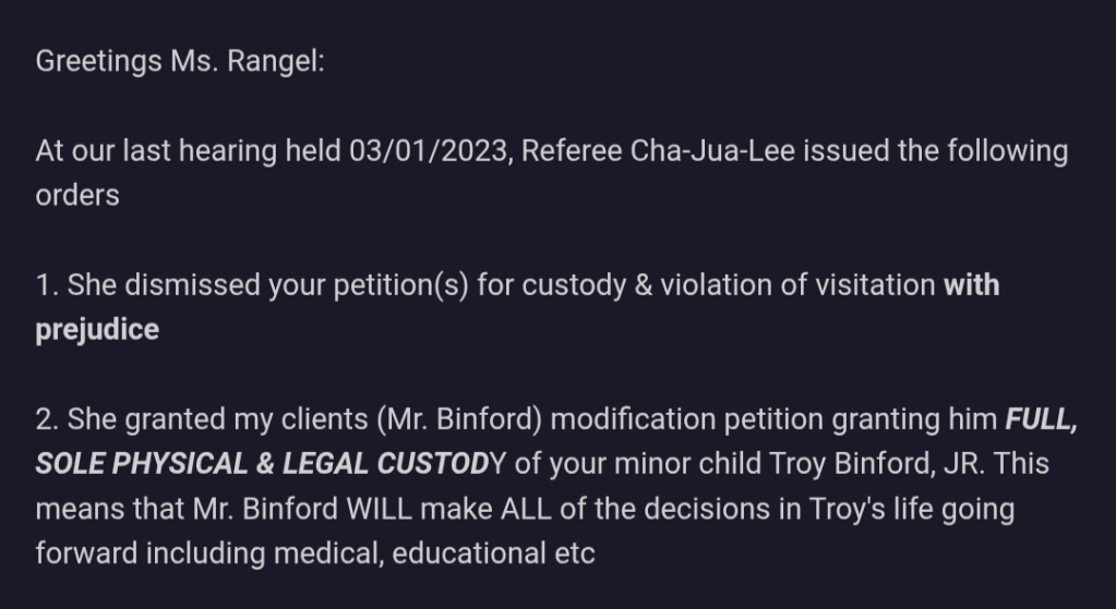 In this correspondence, Idehen informed me that sole custody of my son had been granted to his client (the child’s father) by the attorney-referee—whom he described or implied as a personal friend, based on prior documented interactions during the proceedings (including shared personal details like vacations). This outcome followed years of ignored abuse allegations and an active order of protection, raising serious questions about impartiality in the process.