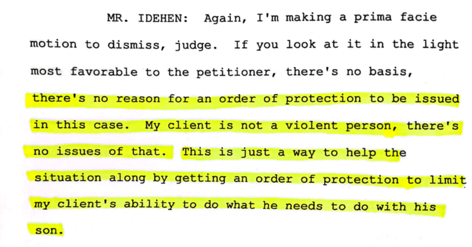 Photo above: Excerpt from the court transcript where Austin I. Idehen states that his client is “not” a violent person. However, the order of protection referenced in the proceedings did not require the father to stay away from my son; it required him only to refrain from abusing me. Despite this, the attorney-referee who oversaw the case chose not to investigate the father’s alleged abuse, even though the order of protection remained in effect from 2019 until 2023.
