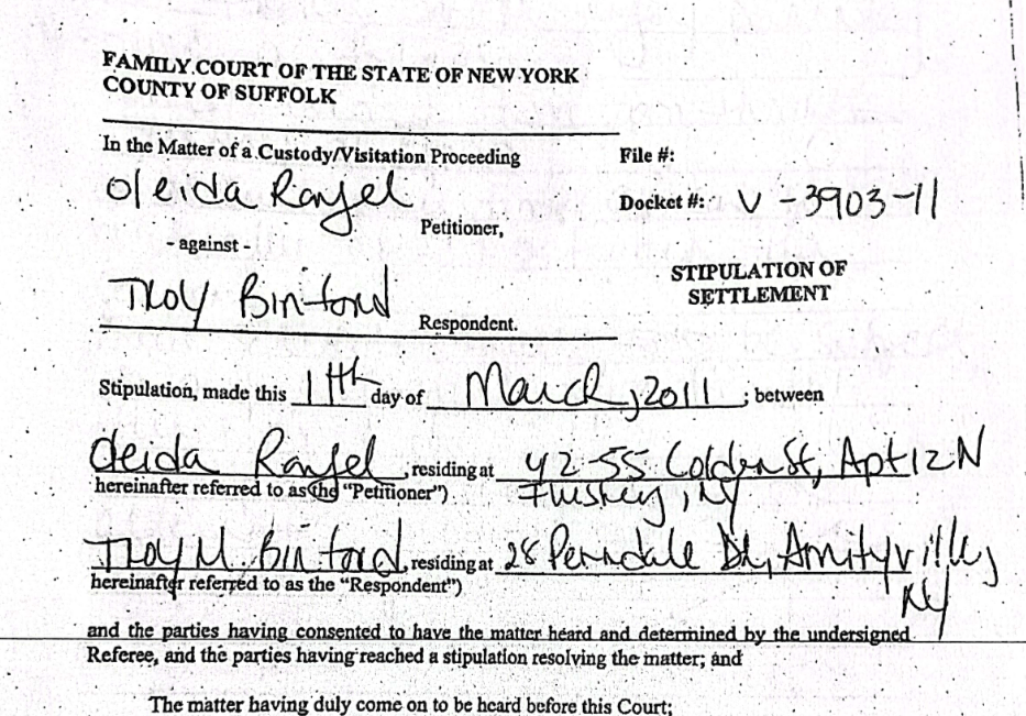 Photo above: First joint custody order granted by Suffolk County Family Court on March 11, 2011 (Docket # V-3903-11).
