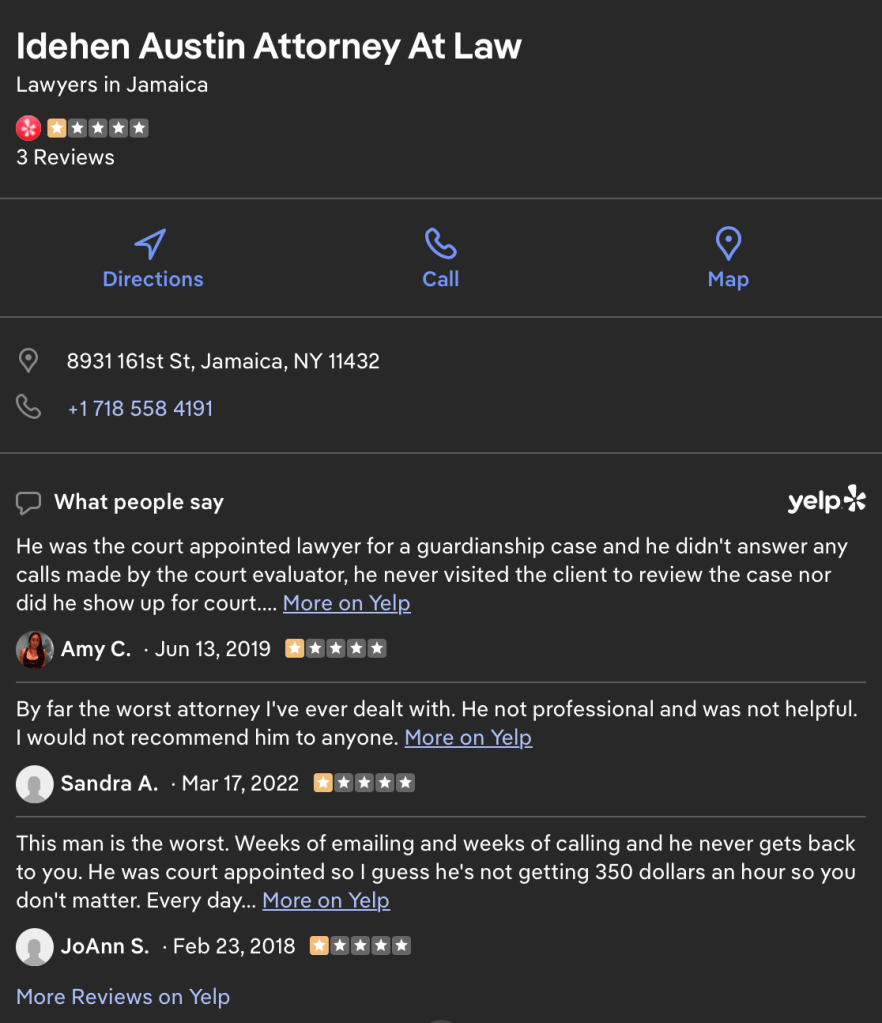 Holding public officials accountable for misconduct is essential to preserving the integrity of the legal system. This includes individuals like Austin I. Idehen, a crooked attorney who has served in the New York family court system, including in Kings County Family Court. I became a victim of what I believe were unethical and incompetent actions on his part, and I have chosen to share my story bravely in order to expose the lack of integrity among those entrusted to uphold the law.
