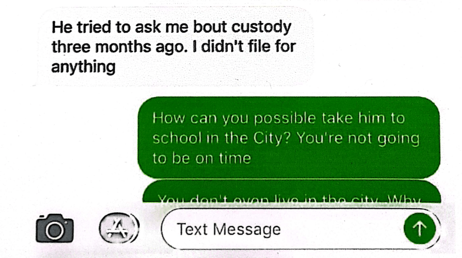 Photo above: Screenshot of a text message from the father of my son, in which he states that Austin I. Idehen instructed him to file for sole custody.